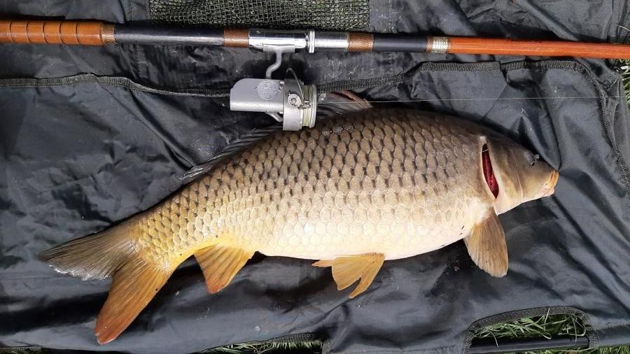 Kapr 95cm chycen na štípaný bambus a naviják HARDY Altex No2 MARK V